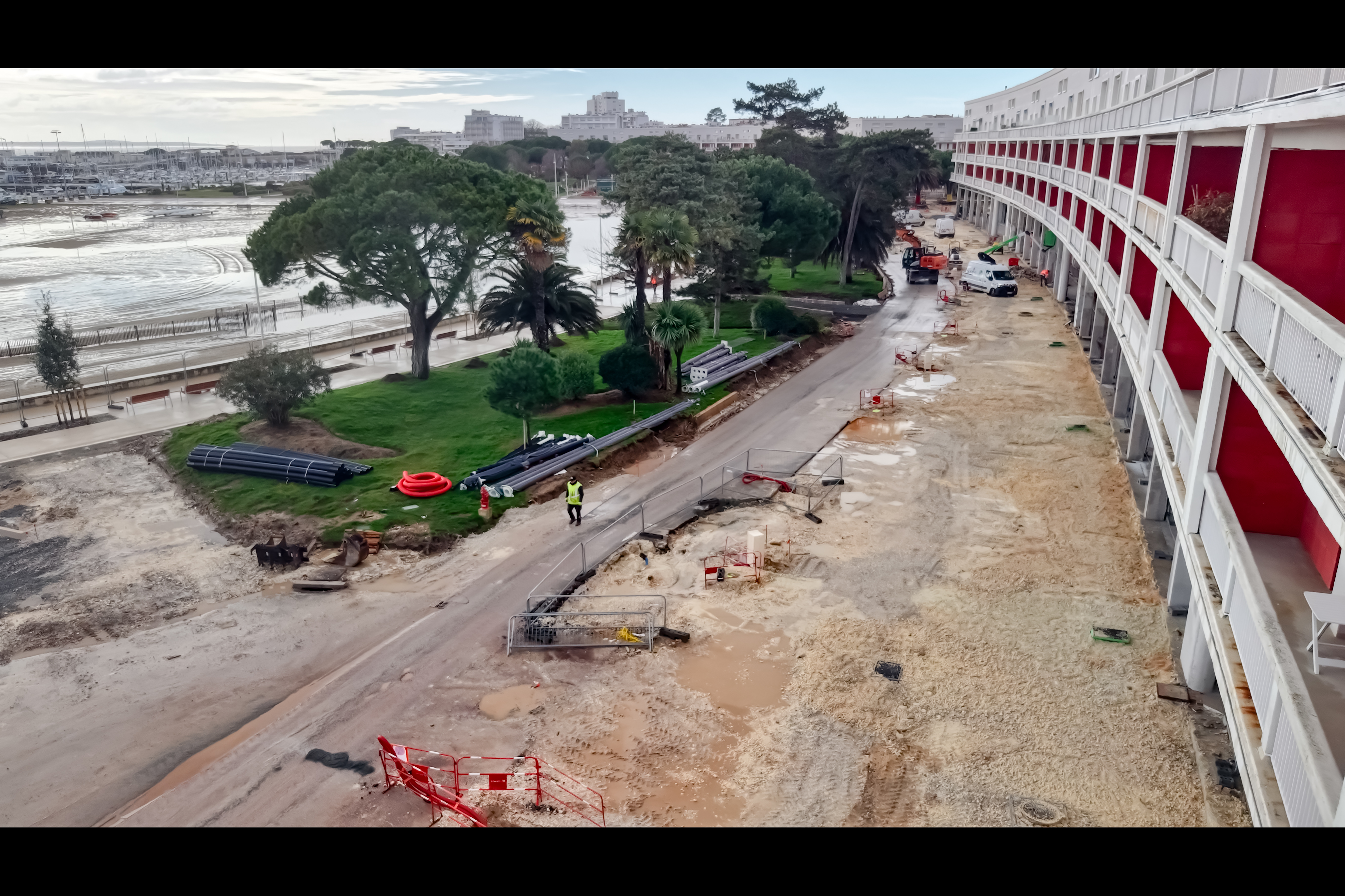 - Une première phase de travaux s’est étalée d’octobre 2024 à avril 2025 pour la partie haute du Font de Mer. Les commerces du Front de Mer sont restés ouverts pendant les travaux. Le Petit Train de l'Ouest fût déplacé, Boulevard de la Grandière le long des Galeries BOTTON.